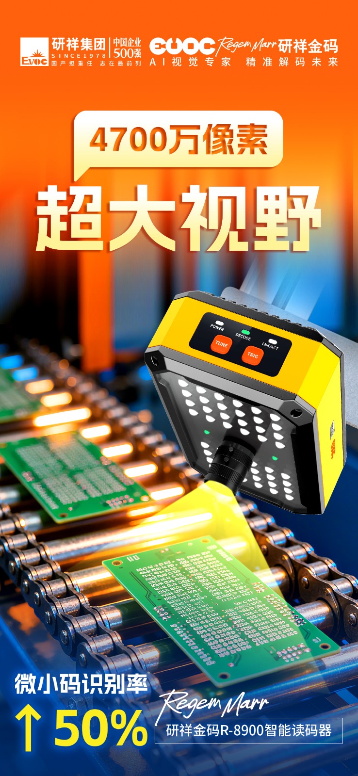 作为行业首款4700万像素的智能读码器,3003.com官网R-8900单次识读即可覆盖500+条码,视野范围高达常规读码器的25倍。